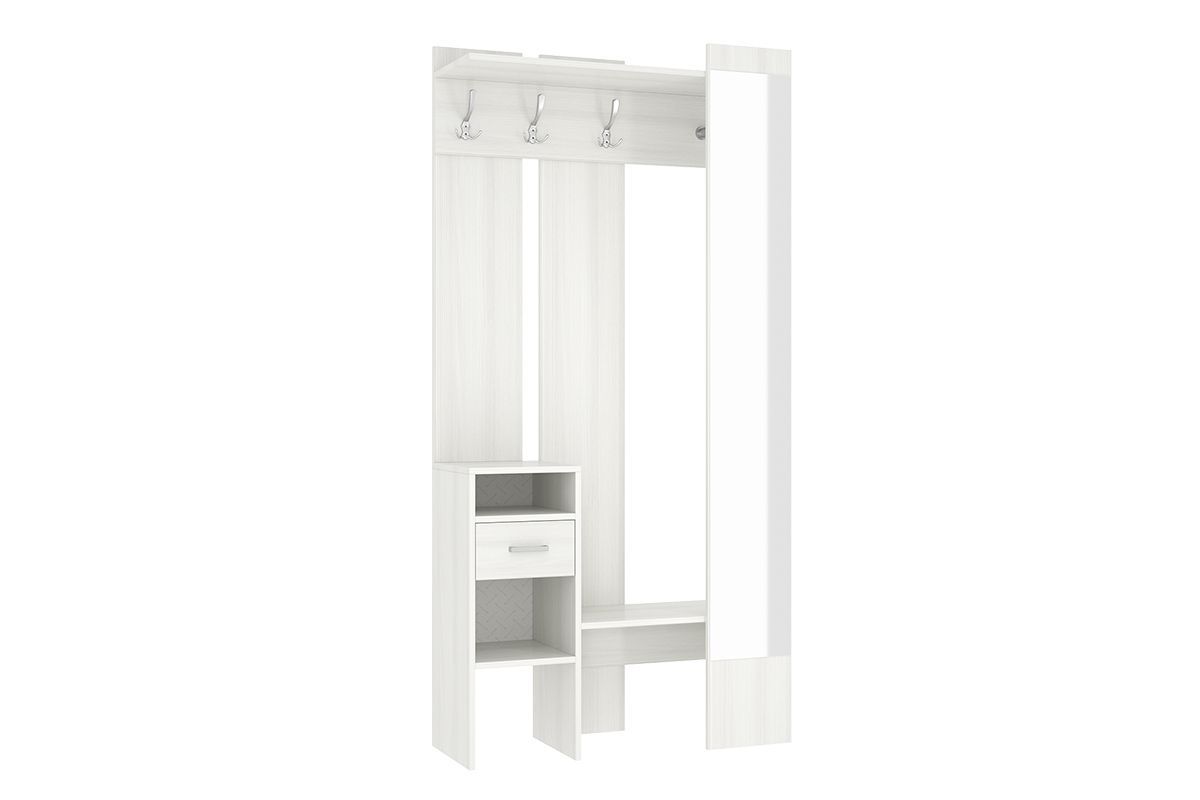 «Агата» создана для Вашей прихожей – Вы можете повесить одежду и сумку на металлические крючки, шляпки положить на полку сверху, нужные мелочи – в выдвижной ящик. На открытых полках можно разместить зонты, перчатки и шарфы. Лицевая панель с зеркалом во весь рост обеспечит комфорт и уют Вашей прихожей. «Агата» - стильная, функциональная, занимает минимум пространства.